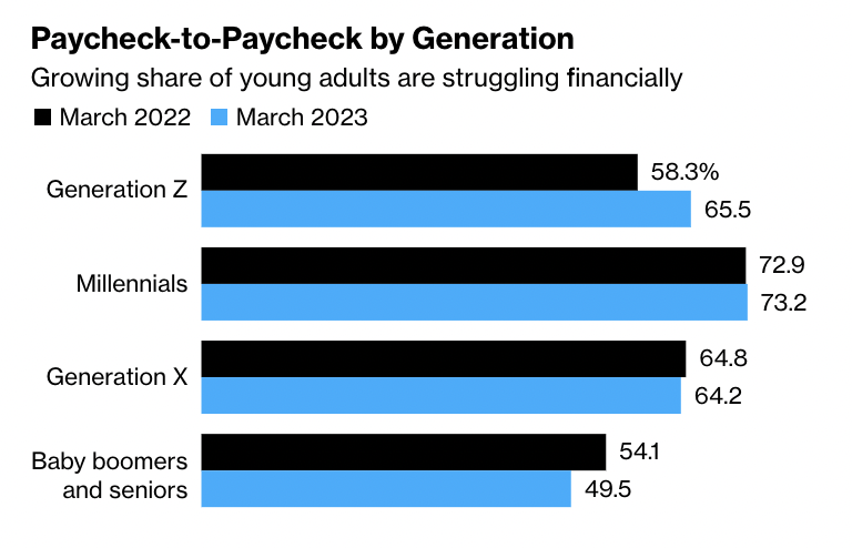 illennials and Gen Z are living paycheck-to-paycheck, compared to Generation X and Boomers, per Bloomberg: h