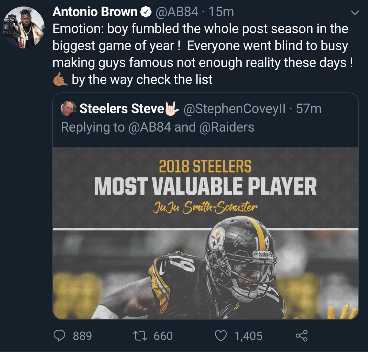 Antonio Brown taking shots at JuJu. Really? Grow up. You wanted out. You got out. You got paid. Just stop already.