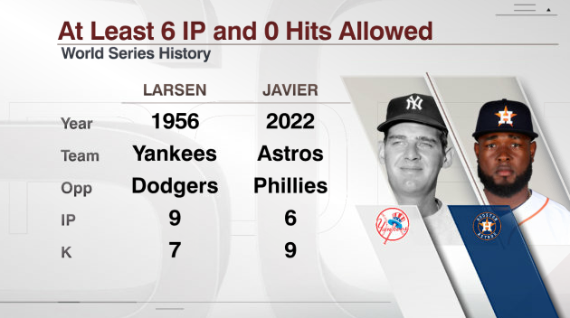 Cristian Javier has the 1st individual no-hit bid of 6+ IP in a World Series game since Jerry Koosman in 1969 WS G2 (6 IP bid)