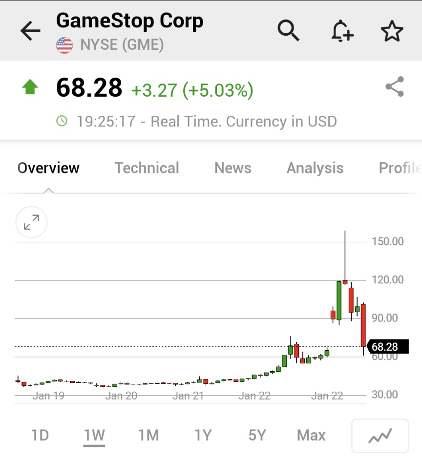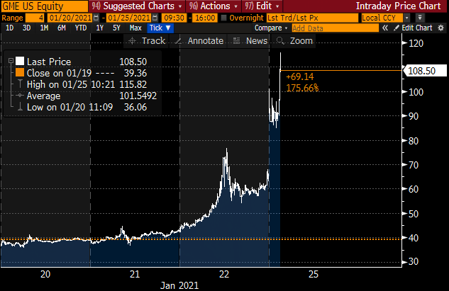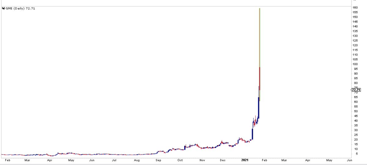 Talking Head: #Bitcoin is just too volatile. I prefer equities. Reality: GameStop $GME day's rage so far is $61 to $159.