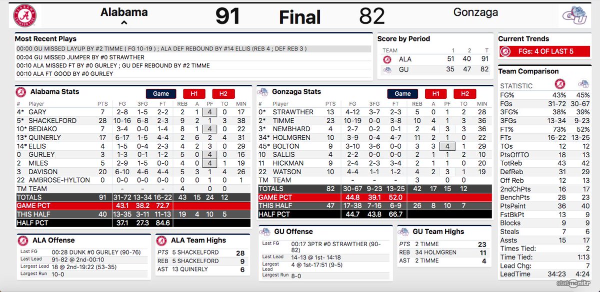 Alabama basketball takes a 51-35 halftime lead on No. 3 Gonzaga in Seattle.